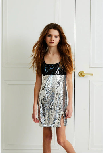 A silver and black tank sequin dress with slit and diamond bow - oh hello! This is a special piece you will love to wear and dance in!