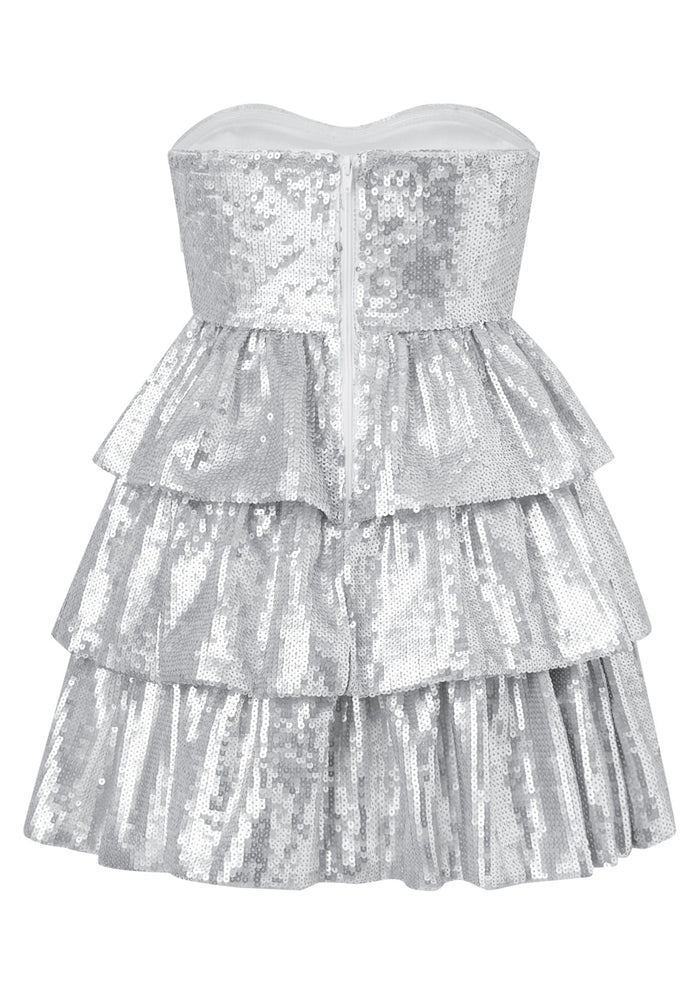 Sparkle through the holidays in the Aubree Mini Dress - a dazzling showpiece designed for festive moments. Crafted in shimmering silver sequins, this strapless silhouette features statement bow detailing and a tiered skirt made for dancing.