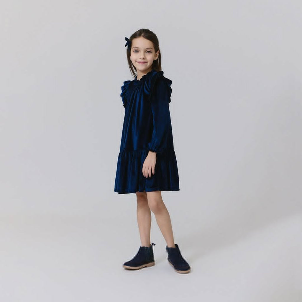 Va Va Velour! Our super swingy Girls Velour Harper Dress features a fluttery ruffle cap at the long sleeve, a ruffled bottom tier of the skirt and an invisible zipper closure at the back.