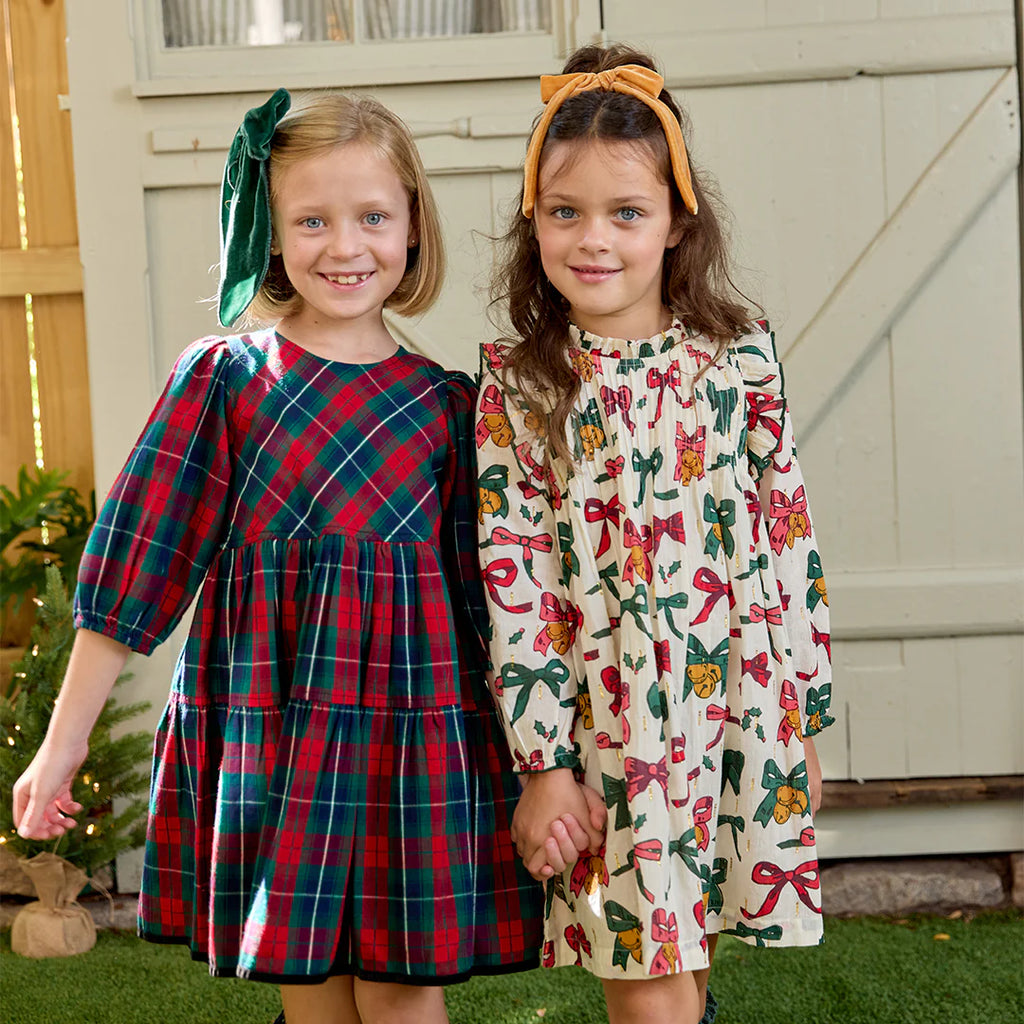 Check this out! Our tried and true Red Tartan makes a brilliant holiday statement on our collection classic Girls Maribelle Dress. A traditional combination of red, green, and navy weaves together to create the perfect plaid. With three-quarter puffed sleeves and a full skirt that's tailor-made for twirling, this flock favorite silhouette is accented with a black velvet taping and a navy glitter button closure at the back.