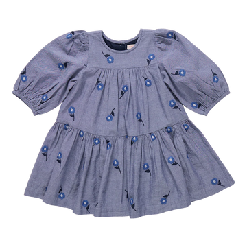 Delicate Flowers! A scattering of sweet daisies bloom from a classic chambray ground in our Blue Blossom Embroidery shown here on our Girls Fiona Dress. Design highlights include elastic puff sleeve, and silver glitter buttons at the back.